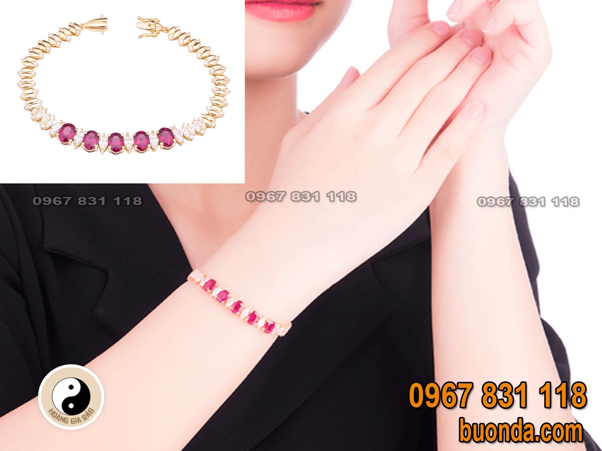 - Lắc tay bằng đá ruby đỏ thường thì hơi khác vòng bởi nó còn cần nguyên liệu từ vàng để tạo nên, có thể dùng nhiều viên đá được gắn vào nhiều ổ bằng vàng rồi liên kết với nhau hoặc là cả một chiếc lắc có một viên đá ruby hồng ngọc to duy nhất làm điểm nhấn.